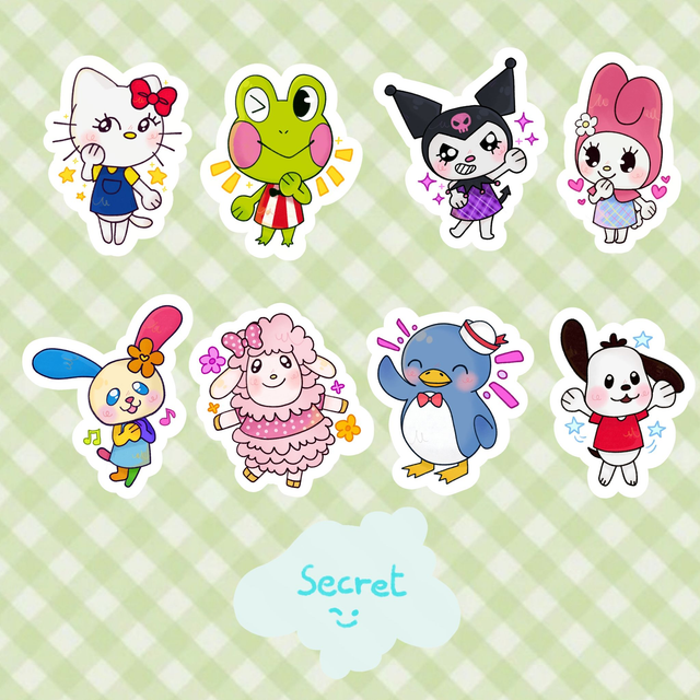 Among these 3 stickers you can have: Hello Kitty, My Melody, Keroppi, Kuromi, Tuxedo Sam, My Sweet Piano, Usahana, Pochacco and a secret character !!